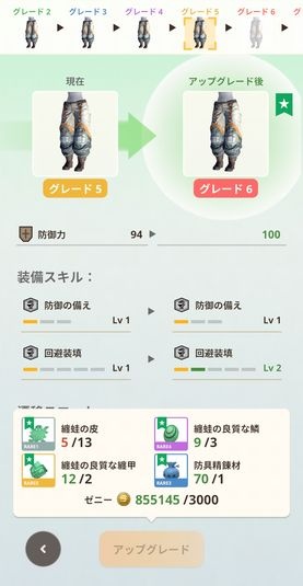 ただ、『固有レア5素材』を使用したグレード6の装備はSPの威力強化や新しいスキルが付与されるといった強化の恩恵がかなり大きいラインとなる